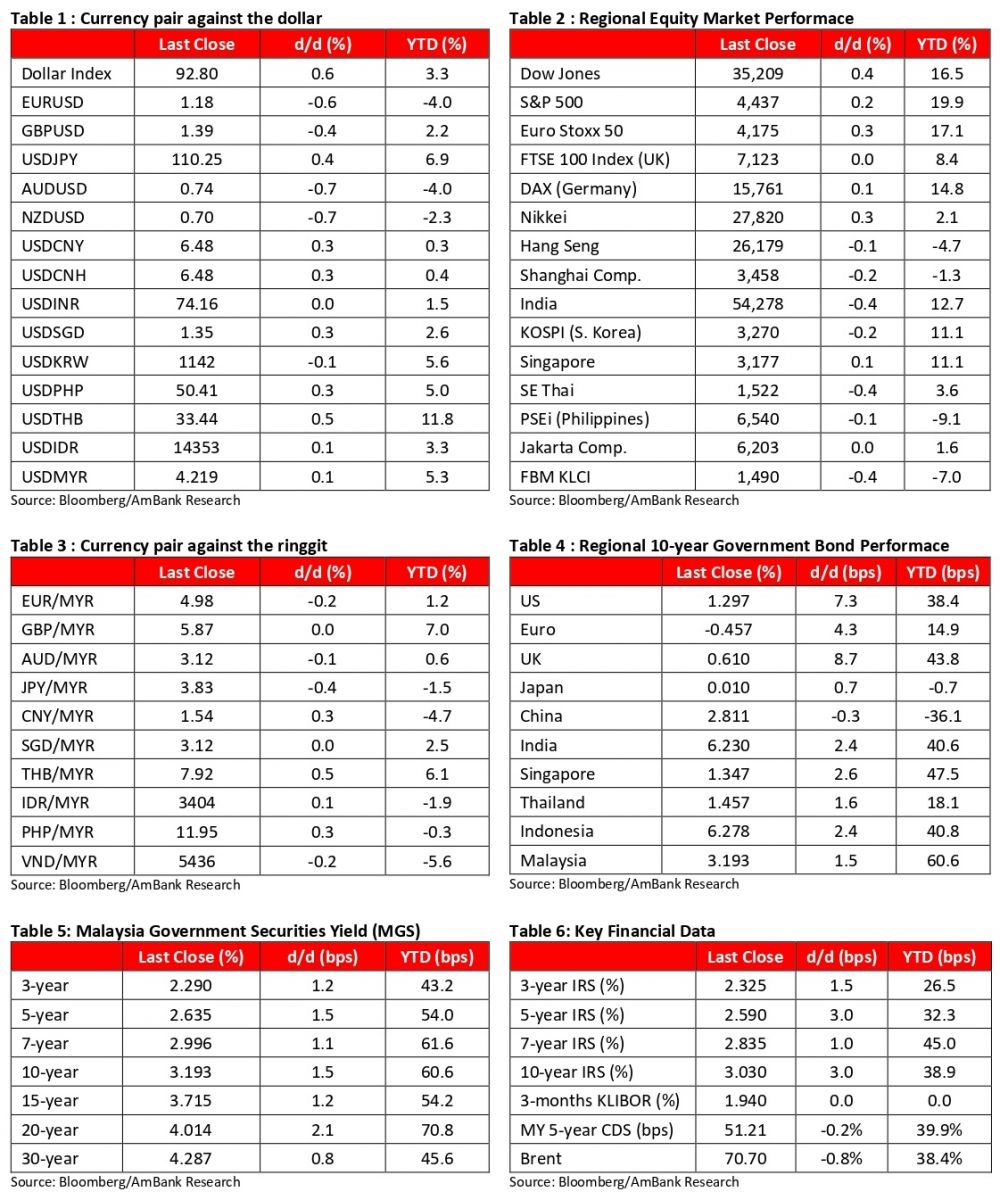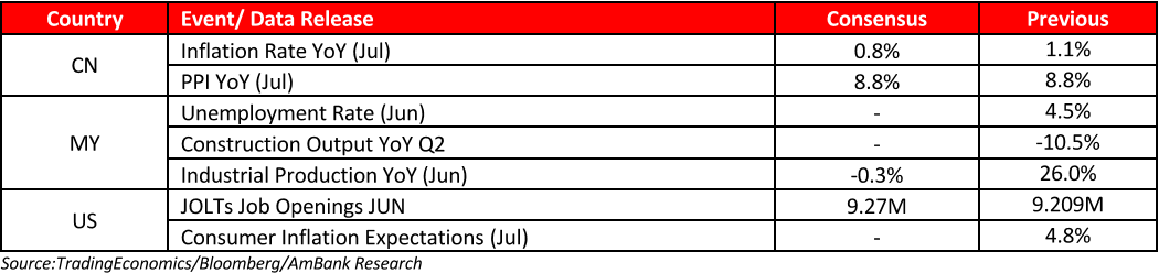 Equities closed at record-level when S&P500 gained 0.17% to 4,437 and Dow Jones increased 0.41% to 35,209, also supported by the strong labour data.The strong sentiment has also sent the rising yield of 10Y UST bond higher by +7.34bps to 1.297%, highest since mid-July. Gold was under selling pressure as it shed 2.29% to US$1,763/oz.