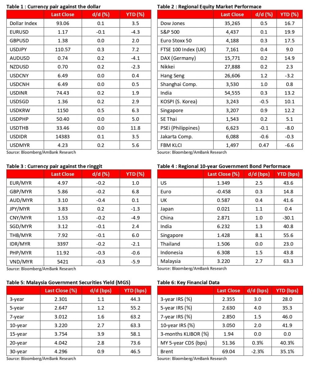Equities rebounded to a record level when the Dow Jones closed higher by 0.46% to 35,265 while the S&P500 rose 0.10% to 4,437 as the Senate passed the US$1tril bipartisan infrastructure bill yesterday. UST 10-year yield added 2.5bps to 1.349% while gold price fell 1.9% to US$1,730/oz.