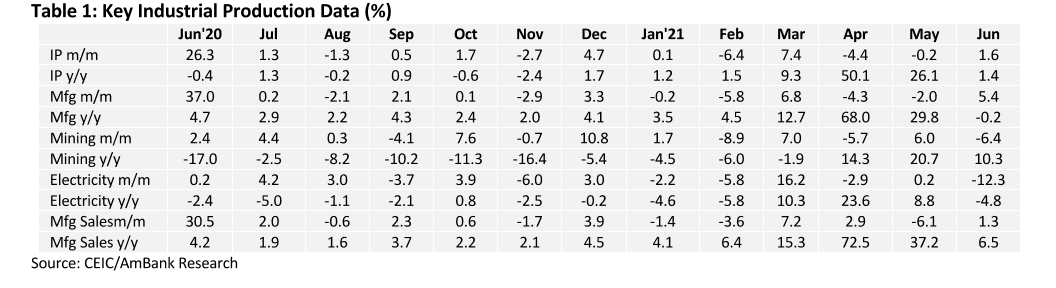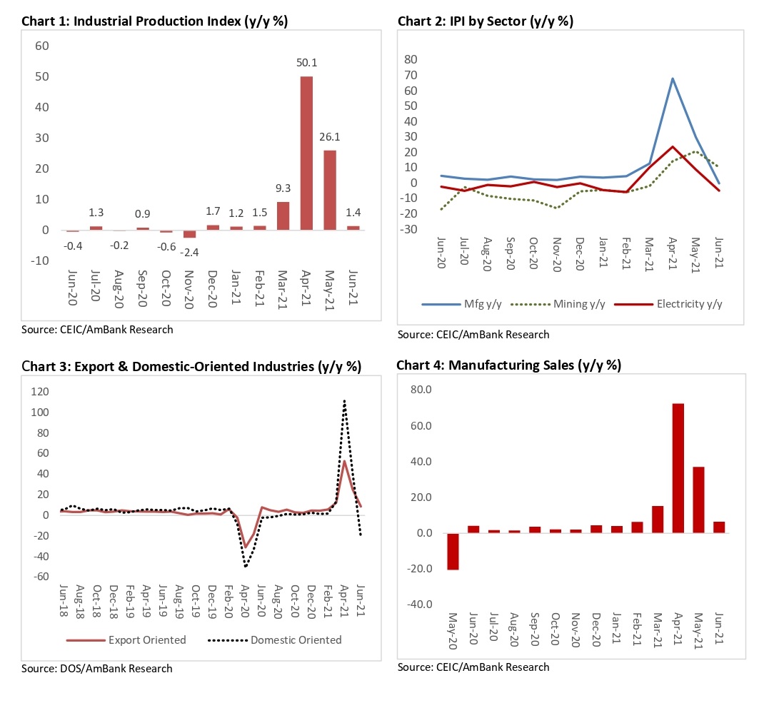 Industrial production (IP) in June rose at a slower pace of 1.4% y/y (May: 26.1% y/y), mainly underpinned by the mining sector (10.3% y/y) while manufacturing (-0.2% y/y) was supported by export-led activities with domestic activities affected by the lockdown measures. Electricity (-4.8% y/y) was also weak in June.