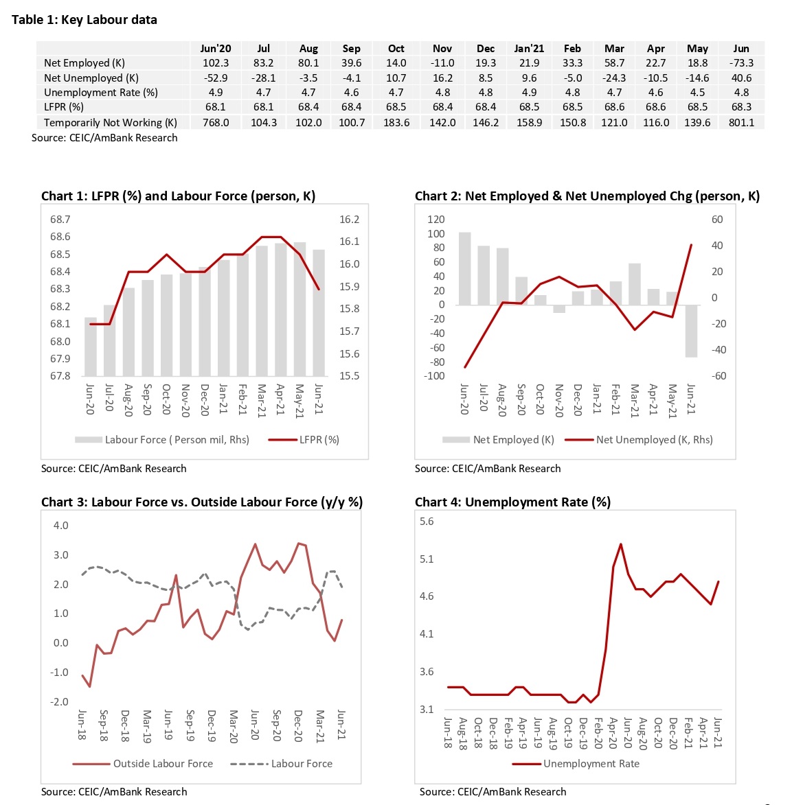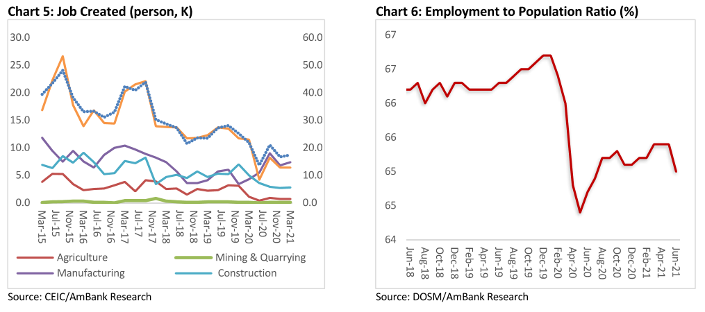 Moving forward, the labour market recovery may hit another bump in July as the government extended Covid19 restrictions, pushing the unemployment rate further from the pre-pandemic level. Still, we maintain our unemployment rate expectations for the full year of 2021 at 4.5%, underpinned by the encouraging vaccination rate, easing restrictions and reverberations of the government's fiscal stimulus.